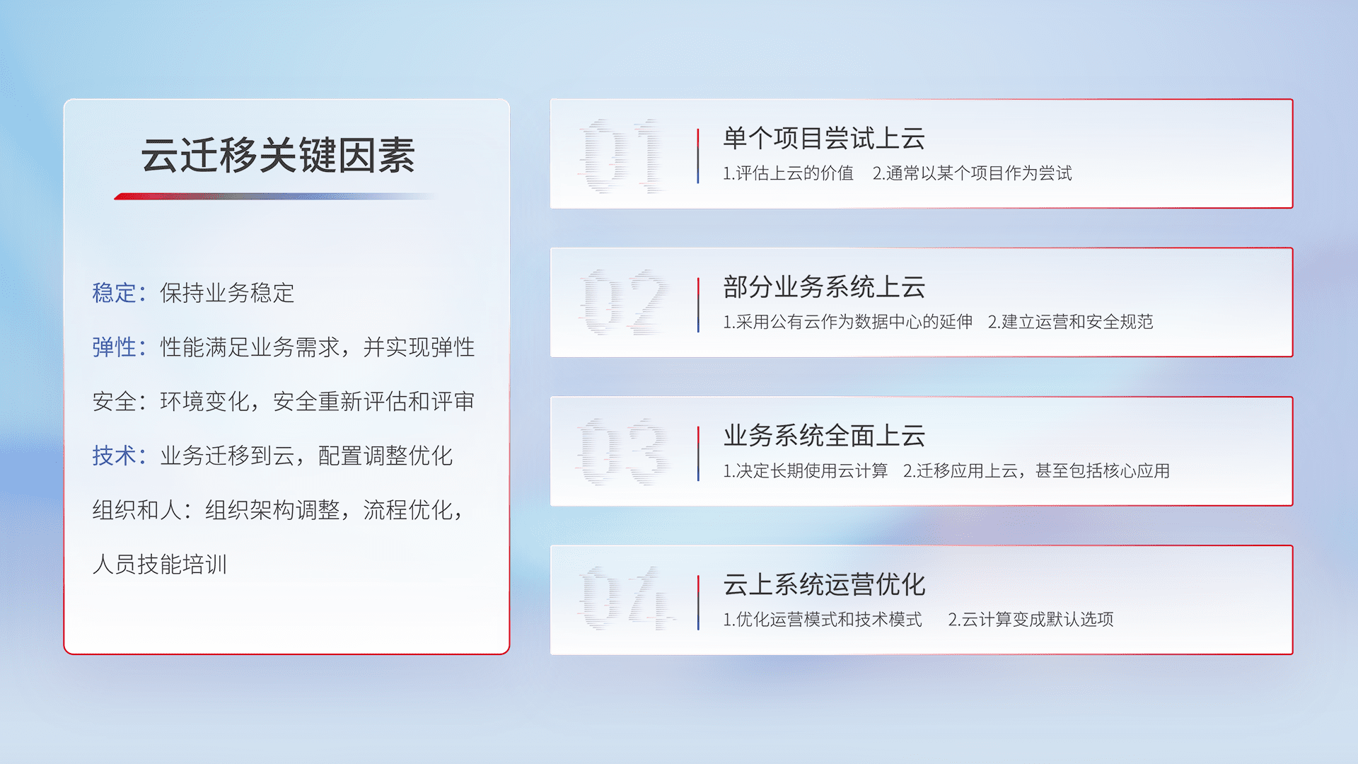 结合实际业务,,,,从规划设计、、、云平台选型、、、、云原生改造、、、、数据迁移、、、、集成交付,,,,迁移全过程为客户识别最佳上云路径,,,,做好风险识别管理,,,,设计网络架构、、、、身份权限、、安全审计合规、、、、操作审计、、日志审计、、监控告警策略、、、、多站点容灾设计等,,,,对云上基础设施进行整体规划,,,,提升IT治理水平,,以满足弹性、、高可用、、、、高性能的需求。。。。