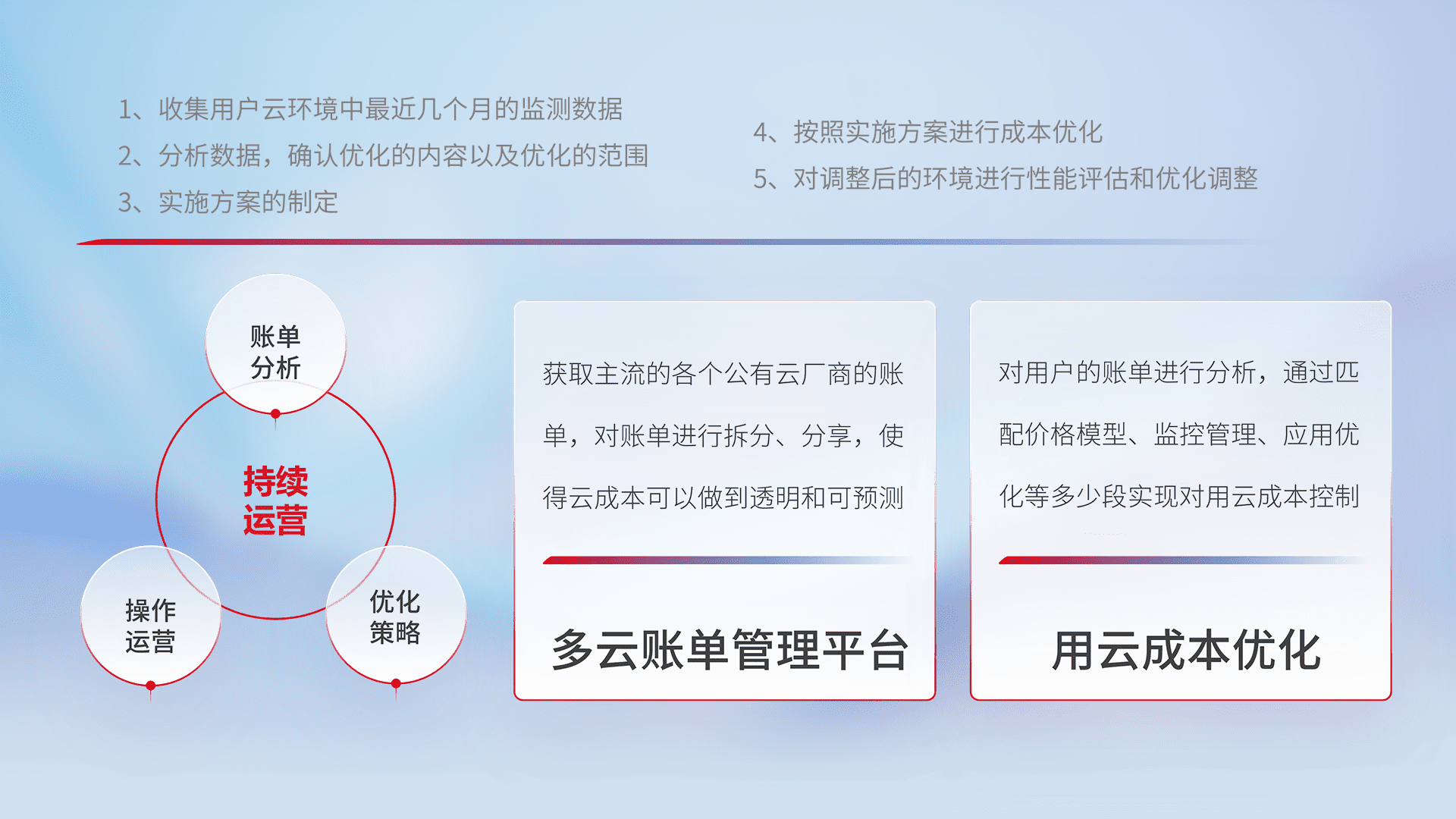 通过多云纳管,,,以统一的资源数据模型把客户的云资源进行抽象和封装,,,进而实现对多云资源的统一操作,,保障云资源管理的可靠性、、稳定性与可用性。。。量身定制化运维内容,,,配置、、、、开发运维、、、、补丁管理、、、备份、、监控、、、认证和访问管理、、、、审计和日常巡检等,,,保障在用云过程中的可靠度,,稳定度以及高可用率。。