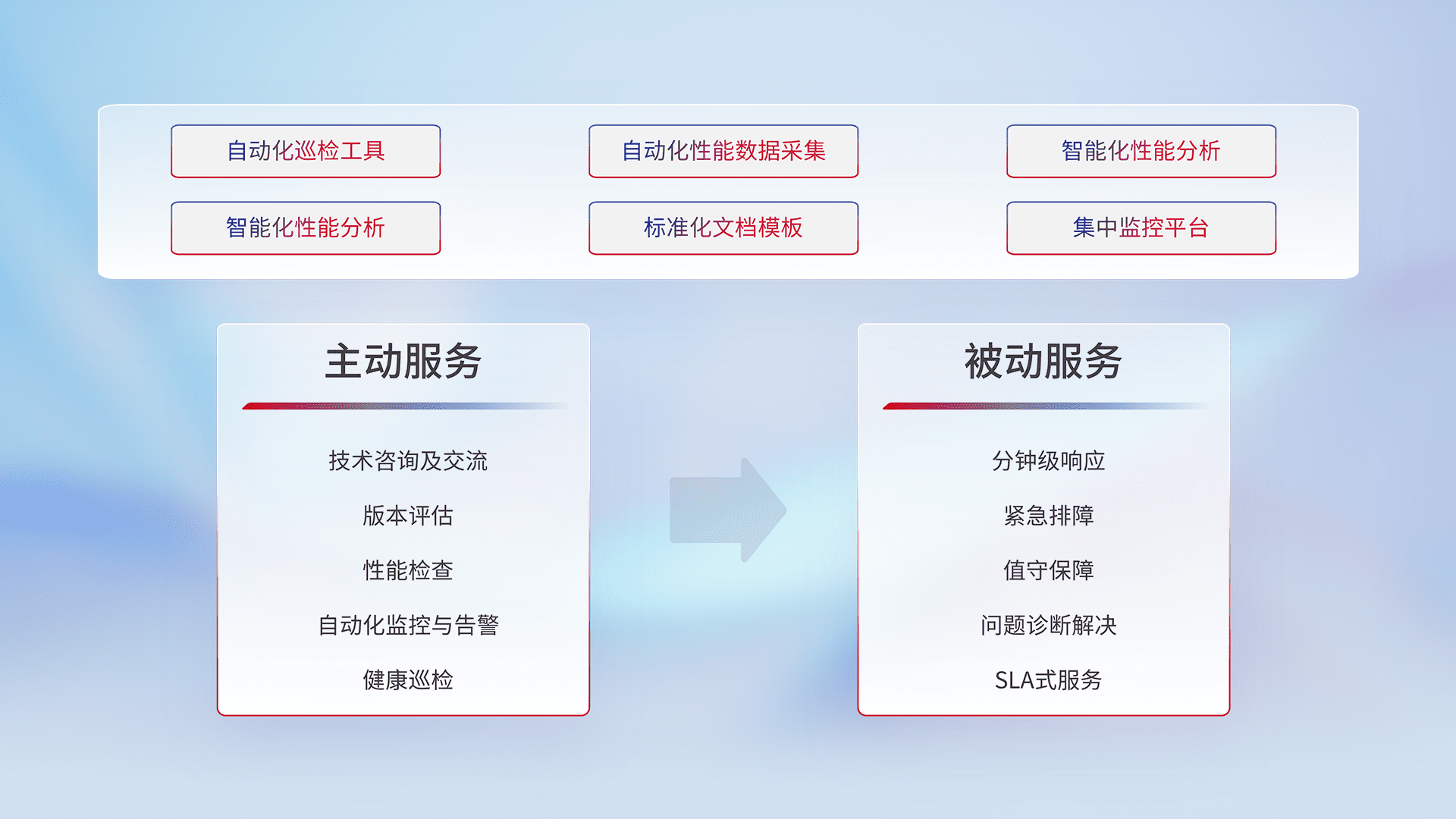 智能化工具和标准化文档,,保障服务质量,,提供主动服务(包含技术咨询、、、、版本评估、、、性能检查、、、、自动化监控与告警、、、健康巡检)和被动服务包含(分钟级响应、、、紧急排障、、、、值守保障、、、问题诊断解决、、SLA服务)。。。